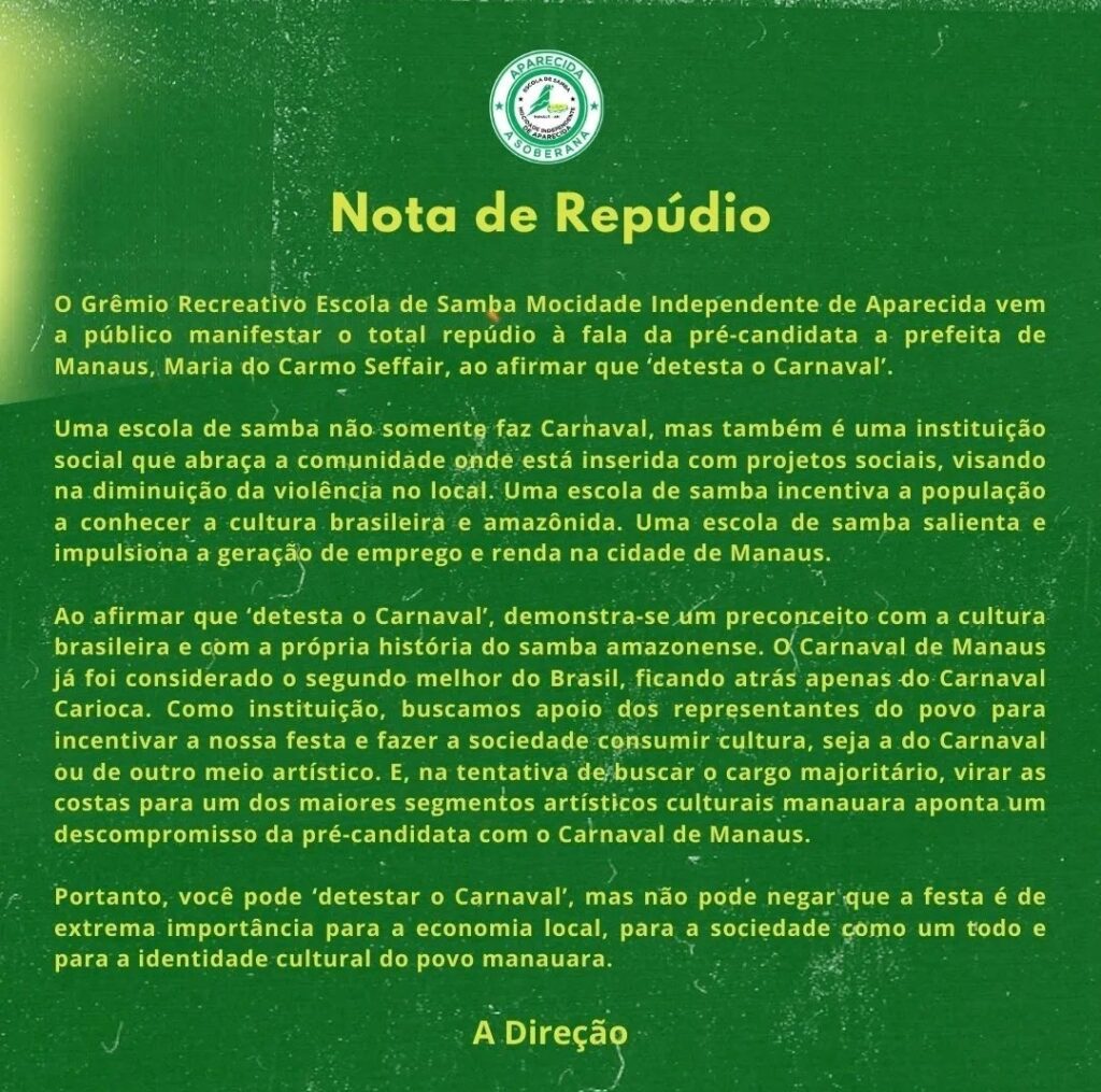 A pré-candidata à prefeitura de Manaus pelo partido NOVO, Maria do Carmo Serffair, causou revolta entre as escolas de samba e o meio carnavalesco de Manaus ao ser questionada sobre suas preferências entre festas juninas e o Carnaval, durante uma entrevista à TV Norte e ao Portal Norte, realizada na última quarta-feira (17).